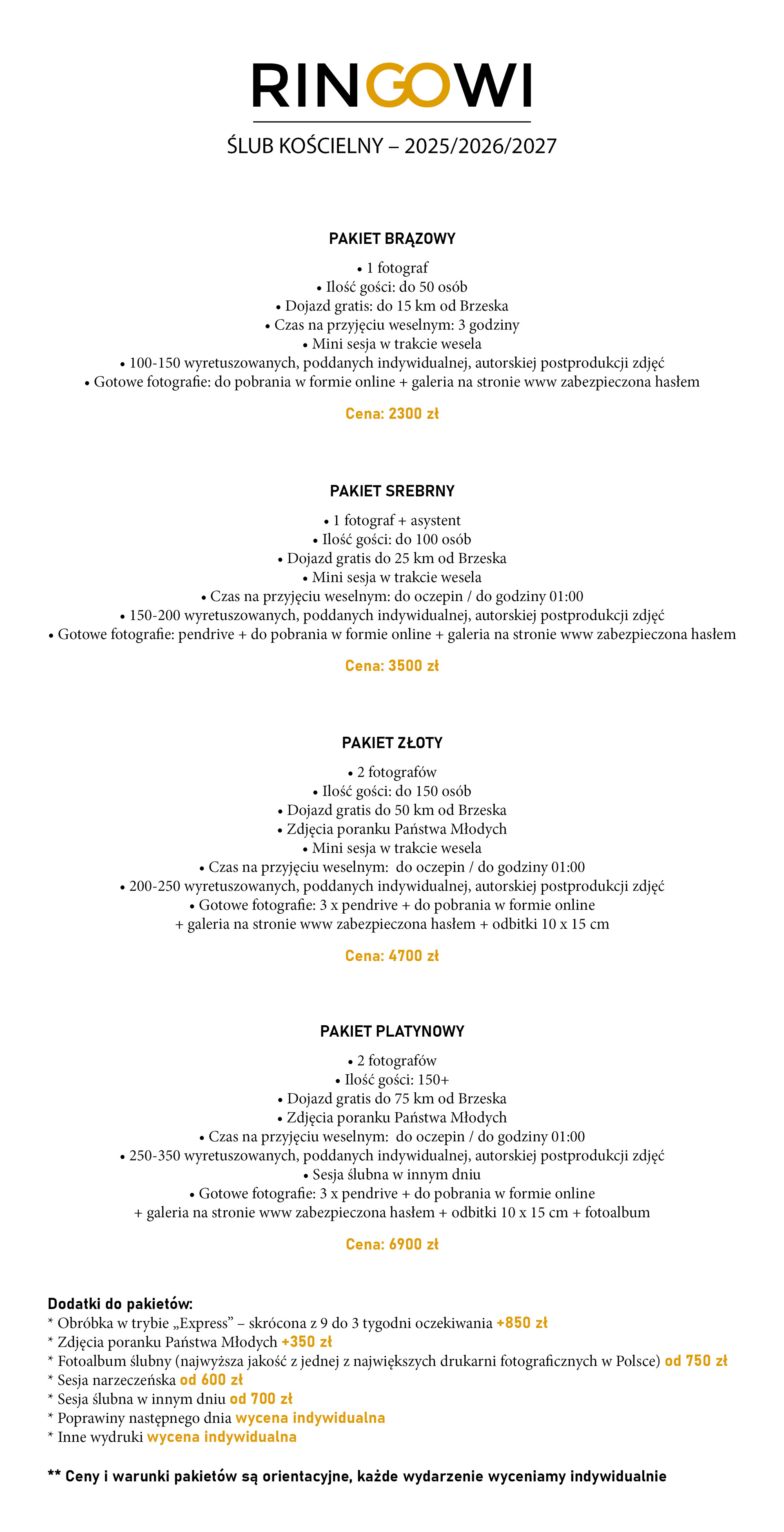 Zapoznaj się z naszą ofertą ślubną na rok 2024, 2025 i 2026! W celu poznania ceny sesji zdjęciowej skontaktuj się z nami – wycena indywidualna stworzona specjalnie pod oczekiwania klienta.